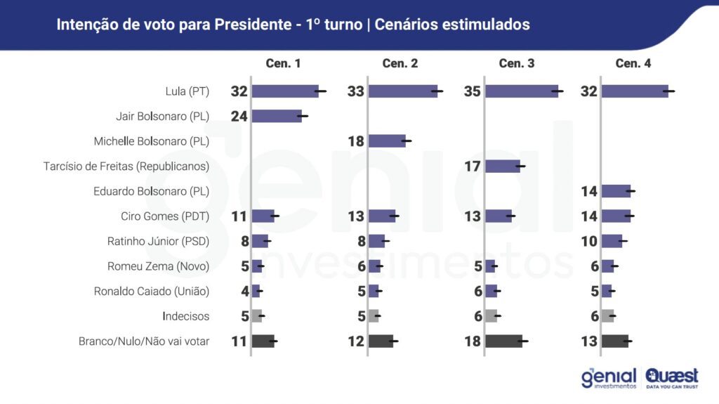 A pesquisa estimulou oito cenários de primeiro turno, sendo quatro deles com a presença de um nome forte ligado ao campo do bolsonarismo e quatro com o campo dividido. Nos quatro primeiros, Lula aparece na ponta, com percentuais entre 32% e 35%, enquanto Bolsonaro — que está inelegível — é o que mais se aproxima, com 24%. Na terceira colocação, Ciro Gomes (PDT) tem percentuais que oscilam entre 11% e 14%, chegando a um empate numérico na segunda colocação no cenário com o deputado federal Eduardo Bolsonaro (PL-SP) — ambos têm 14%.