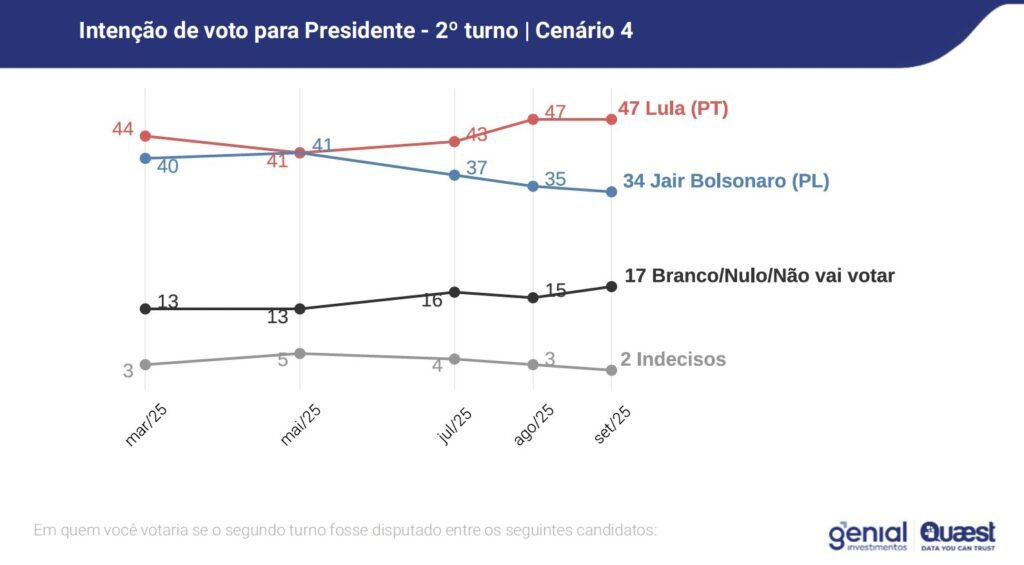 Encomendada pela Genial Investimentos, a pesquisa Quaest ouviu 2.004 pessoas entre os dias 12 e 14 de setembro, logo após a condenação do ex-presidente Bolsonaro. O nível de confiabilidade da pesquisa é de 95% e a margem de erro é de 2 pontos percentuais.