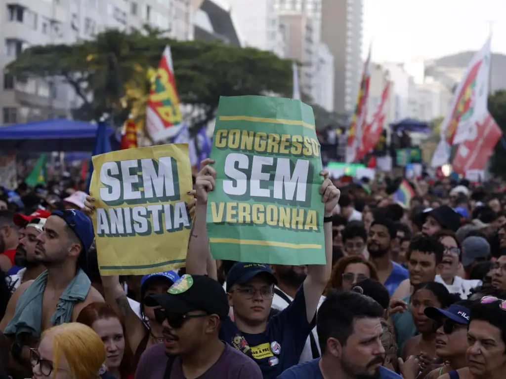 Milhares de pessoas ocuparam neste domingo (21) a Praia de Copacabana, na zona sul do Rio de Janeiro, para protestar contra a PEC da Blindagem e a anistia a condenados por golpe de Estado pelo Supremo Tribunal Federal (STF), entre eles o ex-presidente Jair Bolsonaro, ex-ministros e aliados.