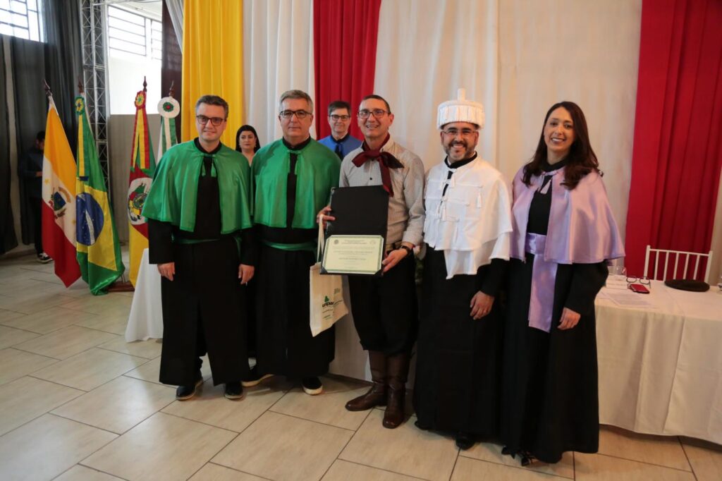 Após a abertura oficial da cerimônia, os presentes puderam acompanhar a apresentação do Fênix Grupo Folklorico, com adaptação coreográfica do espetáculo “Missões: a saga Jesuítico-Guarani”. Na sequência, o professor do Campus Itaqui, Augusto Gonzaga Oliveira de Freitas, proponente do título aos Quatro Troncos Missioneiros, fez a leitura do motivo que fundamenta a concessão do título de Doutor Honoris Causa. Em seu discurso enfatizou: “a cultura não é adorno; ela é a fundação onde a memória histórica se constrói e a bússola que orienta o futuro”. Para o docente, “valorizar nossa história, nossas raízes e a arte que delas emana é mais do que um ato de respeito; é um imperativo para a construção de uma sociedade que se reconhece, que se orgulha de sua trajetória e que, por isso, é capaz de vislumbrar um futuro com mais justiça e dignidade”.