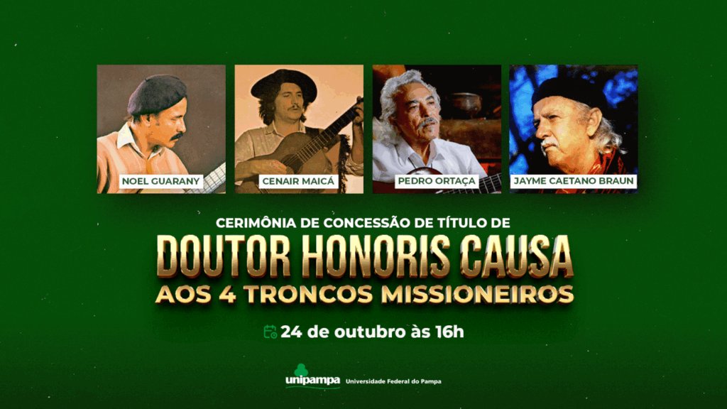 “Este é um dia histórico, um dia em que a universidade pública se ajoelha com humildade diante da grandeza da cultura popular. E, ao mesmo tempo, levanta-se com orgulho para dizer: Doutores, sim! Mestres, sim! Patrimônio vivo, sim!”. Com essas palavras, o reitor da Universidade Federal do Pampa (Unipampa), Edward Frederico Castro Pessano, define a sexta-feira, 24 de outubro de 2025, data escolhida para a solenidade de concessão do título de Doutor Honoris Causa a Pedro Ortaça e in memoriam a Jayme Caetano Braun, Noel Guarany e Cenair Maicá, os Quatro Troncos Missioneiros. A cerimônia ocorreu no Espaço Messa, na cidade de São Luiz Gonzaga, na Região das Missões, berço de três dos quatro homenageados.