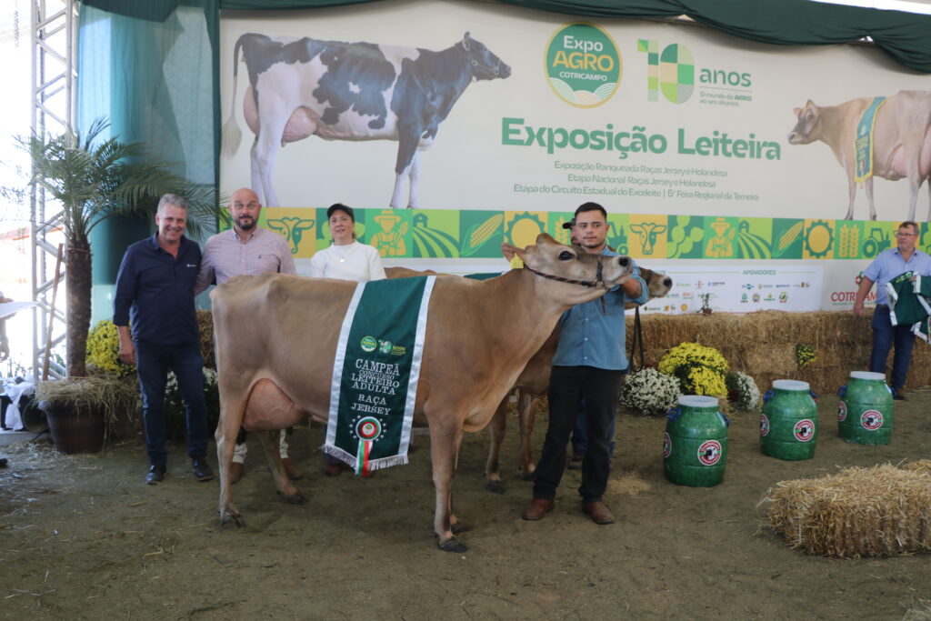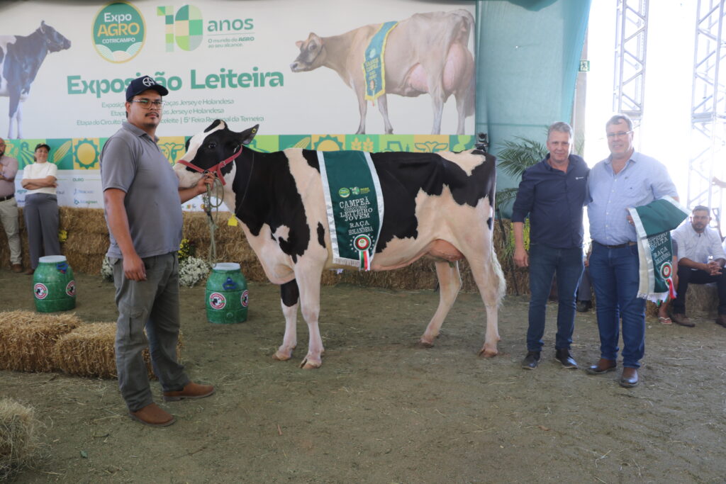 Considerado o Dia do Leite, o sábado de ExpoAgro Cotricampo foi de divulgação das campeãs do concurso leiteiro da raça holandesa na Arena Bovinos. A vaca jovem campeã é STA CLARA FF MIOR LUCIA 182 LAMBDA TE, com a produção de 70,88kg. Na categoria vaca Adulta, a campeã foi STA CLARA FF MIOR 84 LAMBDA TE, com uma produção de 74,24kg. As duas vacas campeãs são da Fazenda Mior, de Serafina Corrêa.