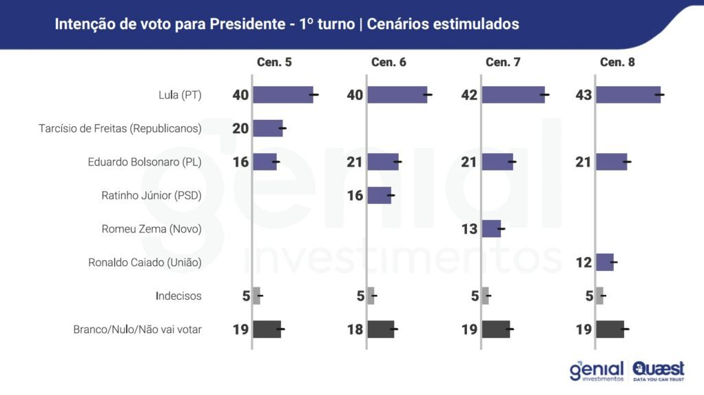 Com relação aos cenários de segundo turno, a Quaest aponta que a diferença de Lula para seus rivais permaneceu estável contra nomes como o do governador de São Paulo, Tarcísio Freitas (Republicanos) — 43% a 35%, mesmo percentual de agosto –, do governador de Minas Gerais, Romeu Zema (Novo) — 45% a 32%, era 46% a 32% em agosto –, e do governador de Goiás, Ronaldo Caiado (União) — 46% a 31% — era 47% a 31%.