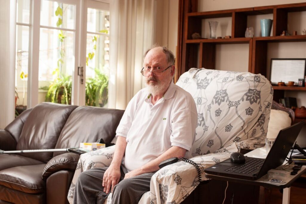 Com a mobilidade física da mão direita reduzida e sob o cuidado contínuo de profissionais de enfermagem, o ex-presidente do Conselho Estadual de Saúde do Rio Grande do Sul Claudio Augustin contraiu o vírus em dezembro de 2020, permaneceu hospitalizado até agosto de 2021 e, desde que recebeu alta, lida diariamente com as sequelas da covid. Servidor público aposentado, Claudio esteve quatro meses entubado, resistiu a diversas pneumonias, realizou várias transfusões de sangue e passou por hemodiálise. Um sobrevivente, Claudio não pode escolher esquecer a pandemia nem por um instante, pois ela está materializada em seu corpo.